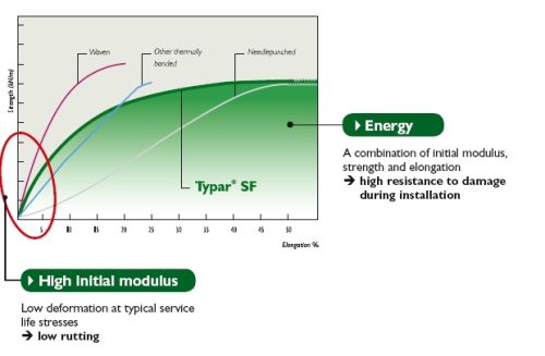 La formation d'ornières peut devenir un problème sérieux, plus particulièrement pour des routes provisoires. Le passage régulier de véhicules crée des contraintes de traction qui déforment le sol. Contrairement à la plupart des autres géotextiles, DuPont™ Typar® SF s'allonge et se déforme très peu pour absorber ces tractions (haut module initial) et il permet ainsi de réduire considérablement la formation d'ornières.